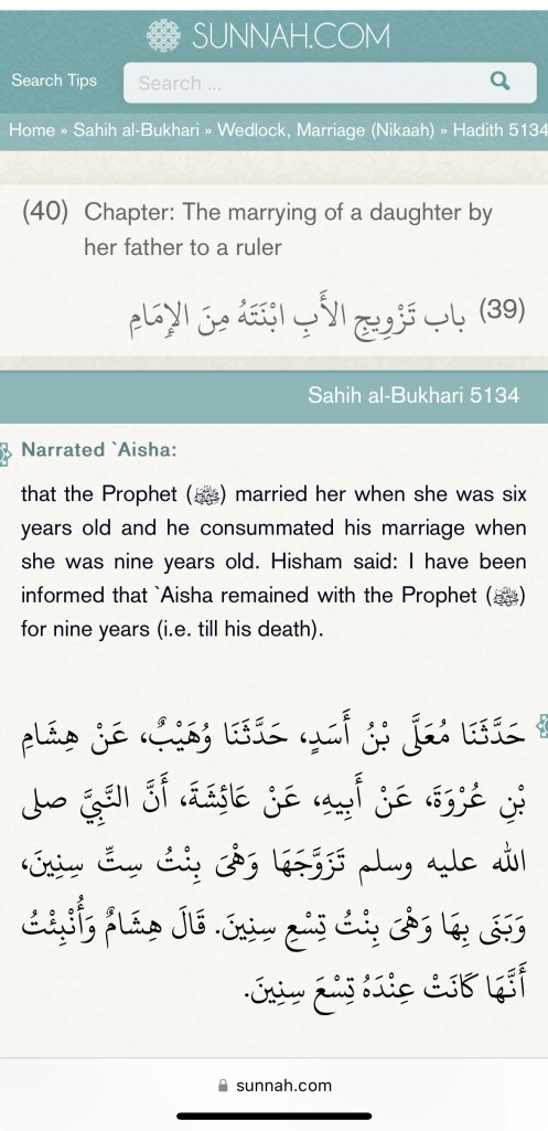 He was a Muslim from Afghanistan. I asked him what he thought about Mohammed marrying Ayesha when she was six and consummated it at age 9. He said who told you that she was 25 the Quran says.