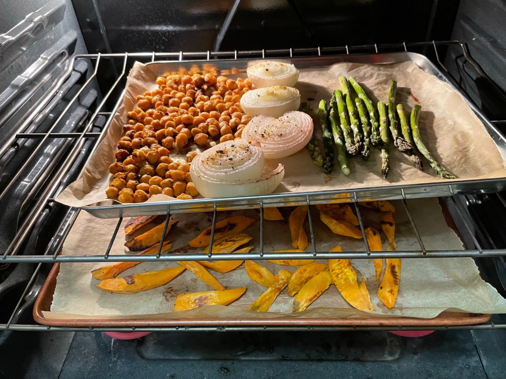 Preheat oven to 400F. Place parchment paper on a baking sheet. Slice the following vegetables into strips: sweet potato, potato, carrot, parsnip and chickpeas. Toss them in 3 tablespoons, olive oil, 1 teaspoon Italian seasoning, salt and pepper and place on the baking sheet. I will add thickly sliced onions or halved brussel sprouts too. Bake approximately 25 minutes.